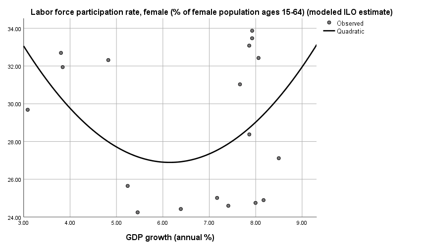In the case of India, it has been observed that the female LFPR increased in the early 2000s, followed by a rapid fall from 31.942% in 2000 to 25.012% in 2017 according to the modeled ILO (International Labour Organisation) estimate.